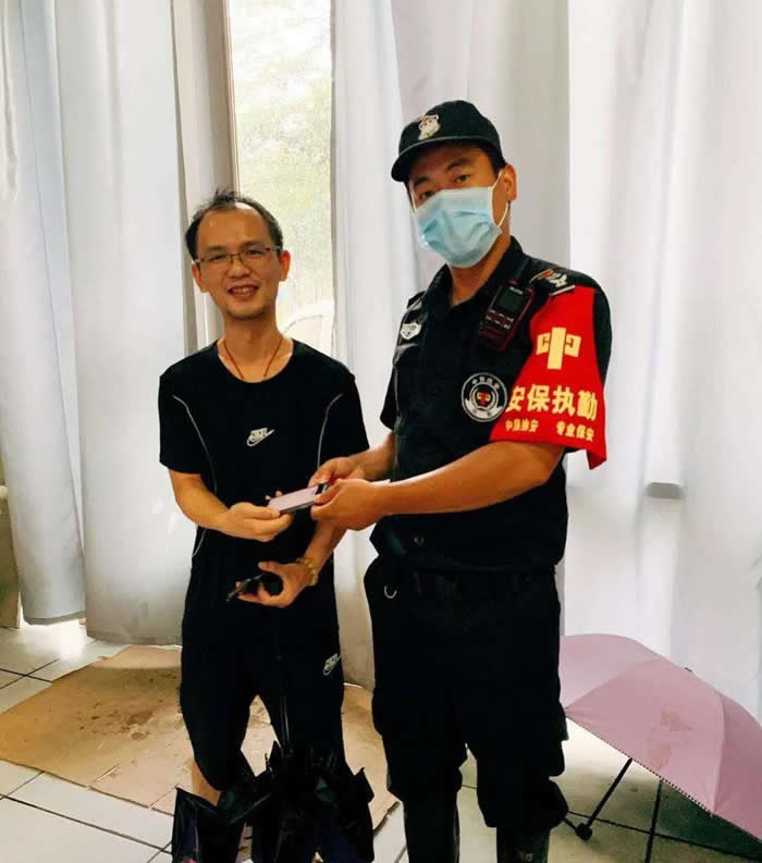 6月7日上午9時34分許,我司駐金融街安保大隊海公園分隊隊員黃敬威值崗巡邏期間,經過園區G棟附近時拾到手機一部,隊員黃敬威立即查看四周情況,當時大雨滂沱,附近無其他人員出現,該隊員冒著(zhe)大雨在原地等待數分鍾後依然無失主前來認領,因天氣原因,他立即上報情況並(bìng)将失物交予負責人吳書容處後,便立即繼續值崗巡邏工作。