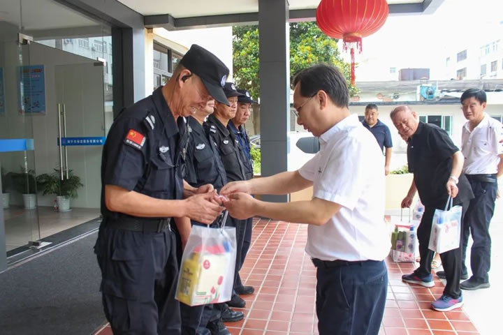 夏日炎炎送清涼,凝心聚力迎亞運。7月19日上午,浙江省保安協會、嘉興市保安協會莅臨海甯保安公司,向奮戰在一線的保安員送上夏日清涼用品和沁人心脾的關懷,並(bìng)囑咐保安員:現下亞運會在即,全省保安行業擰成一股繩,凝心聚力迎亞運,每位在一線辛勤守護平安的保安員,都是這個大團隊(duì)中的重要一員。在提供保障服務的同時也要注意自身健康,這樣才能更好地爲亞運會的勝利召開保駕護航。